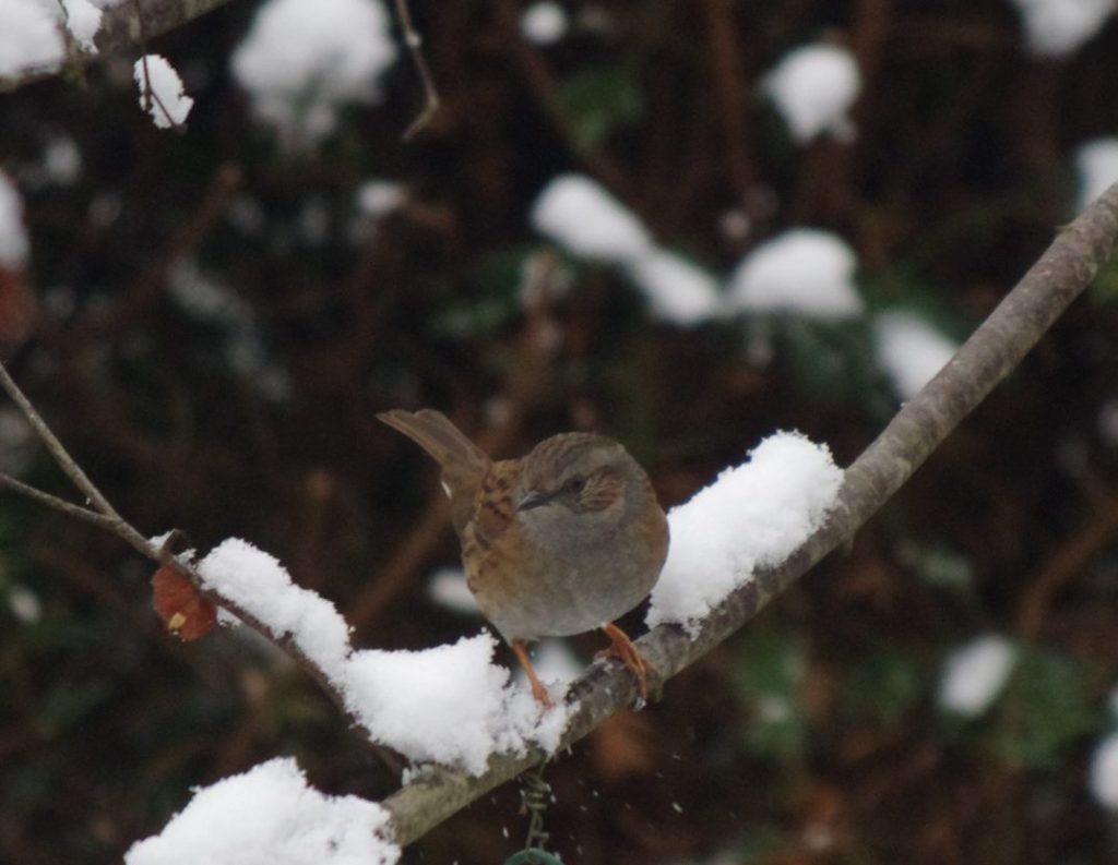 Heggemus. Een altijd wat bescheiden gast die liever op de grond de zaadjes zoekt die de anderen morsen.